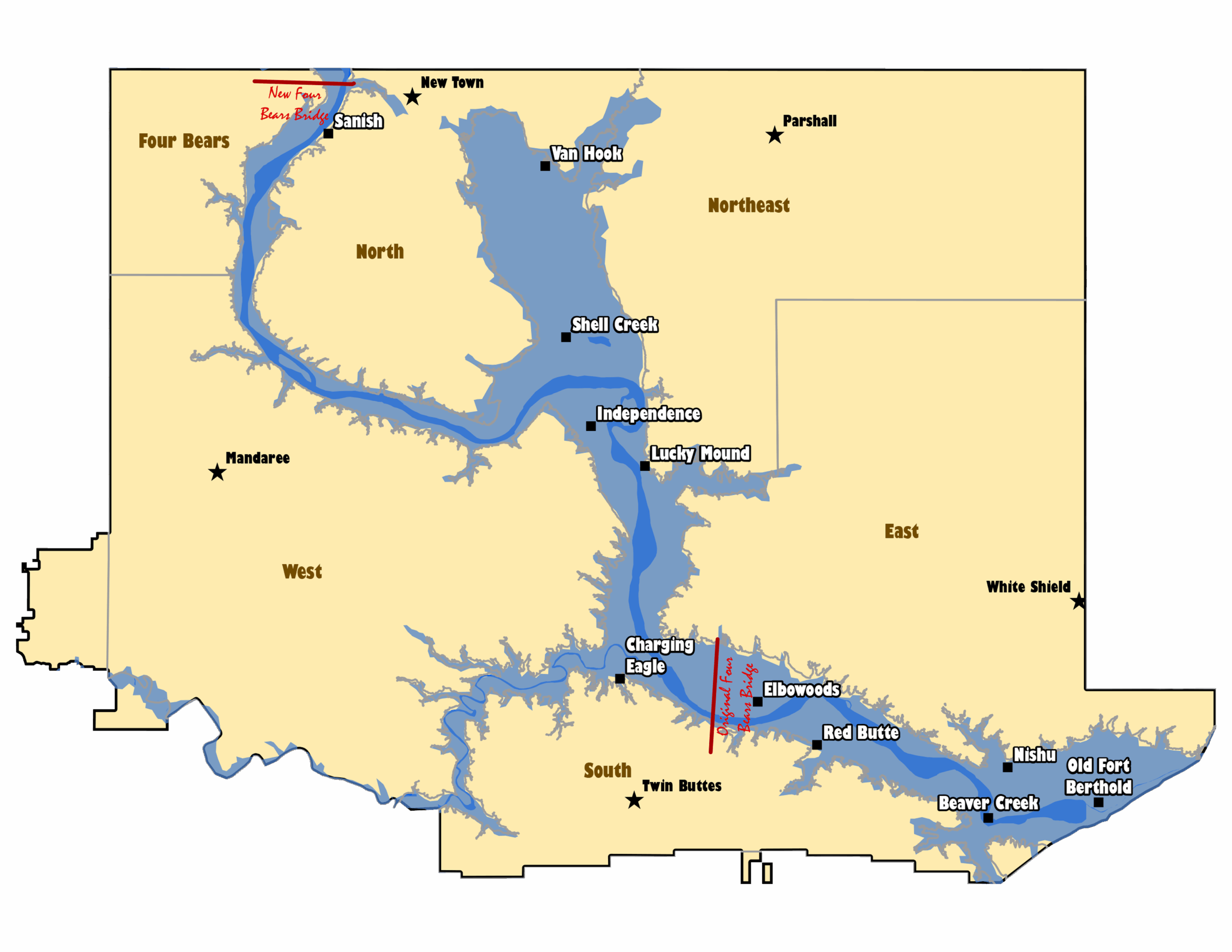 The Tribal headquarters is located 4 miles west of New Town, ND. Our Tribe is divided into six segments: North, North East, West, East, south, and Four Bears.