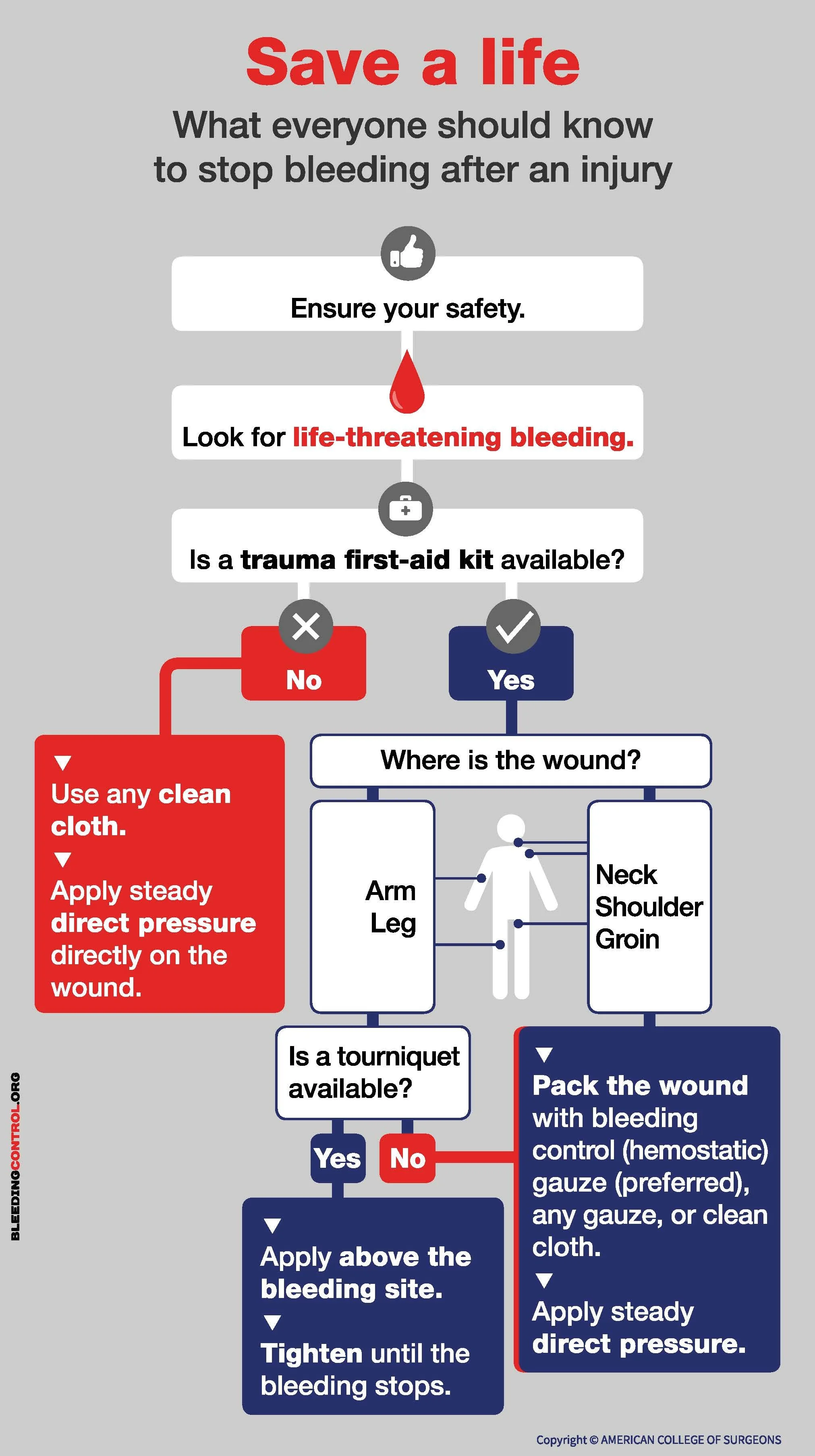 The Stop The Bleed Save a Life Flowchart will help you control bleeding after an injury. Don't forget to always call 9-1-1 first.